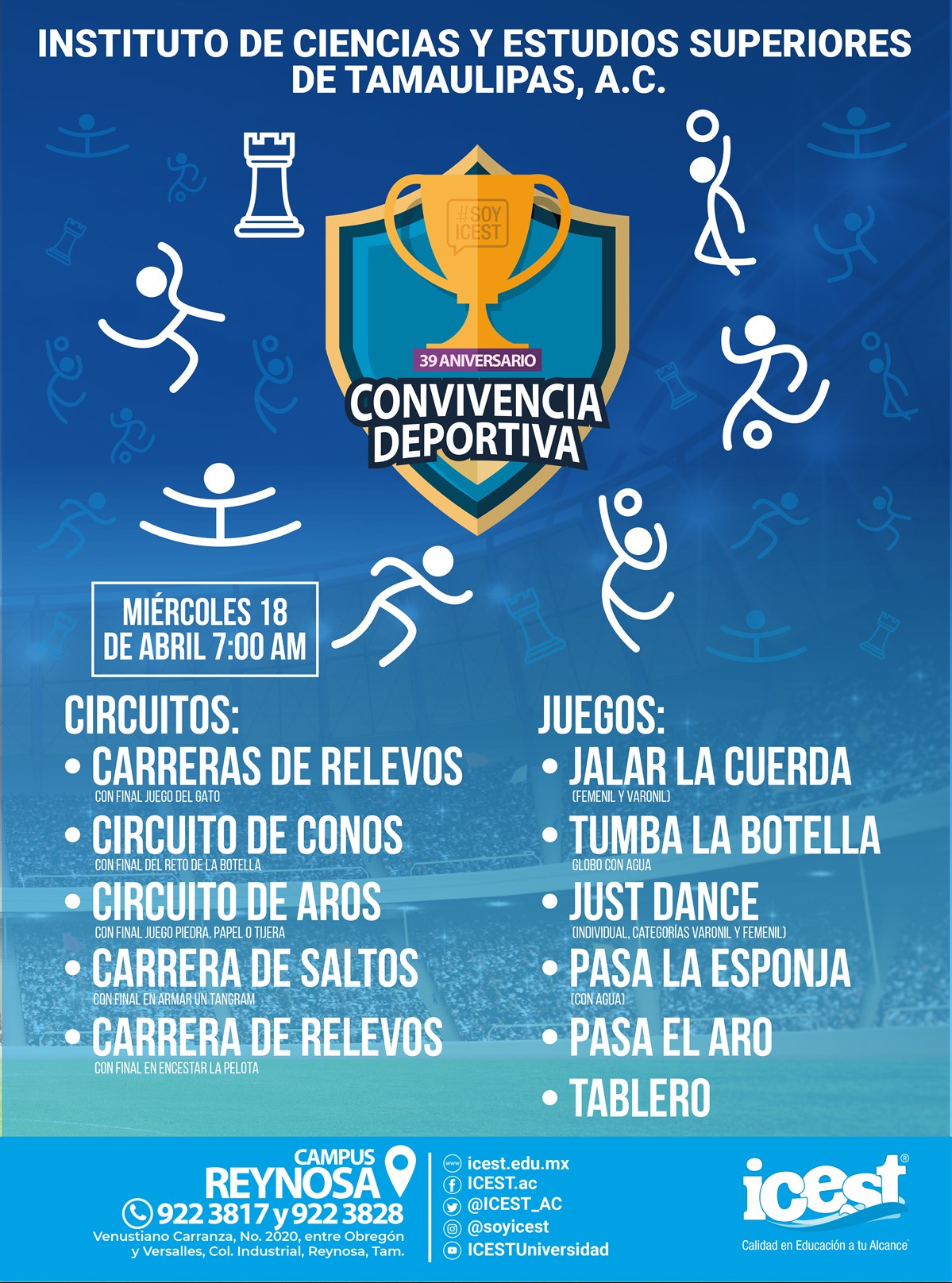 Este miércoles 18 de Abril, se les invita a la Convivencia Deportiva 2018 en las instalaciones del Campus Reynosa, en el marco de la celebración del 39 Aniversario del ICEST.🏀⚽⚾🏐Inscripciones: Con el maestro de deportes de tu campus.Mayores informes: deportes@icest.edu.mx
