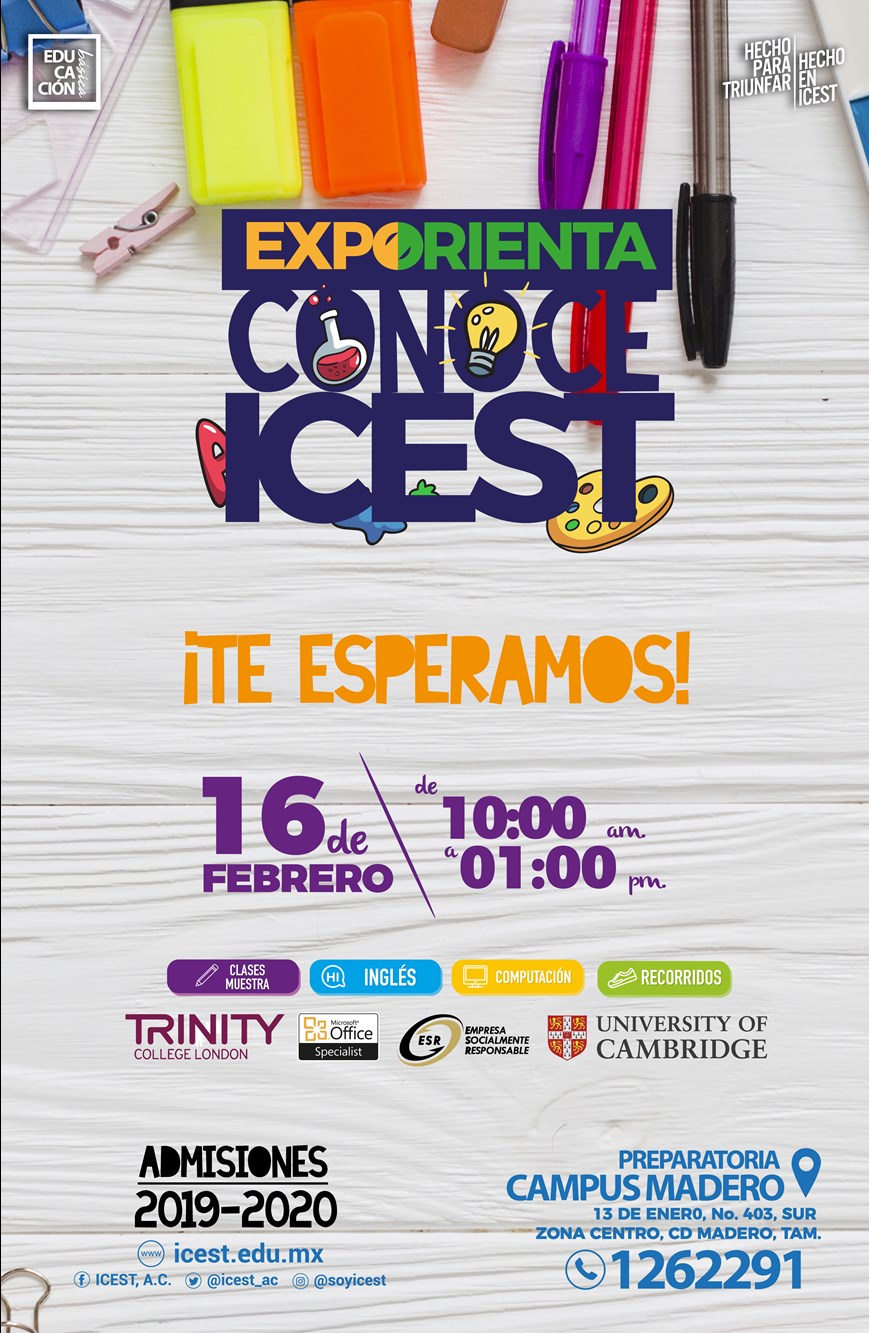 ICEST, A.C., te invita este Sábado 16 de Febrero a la Expo Orienta, en la Preparatoria ICEST Campus Madero. Conoce nuestras instalaciones a partir de las 10:00 A.M. y resuelve todas tus dudas.