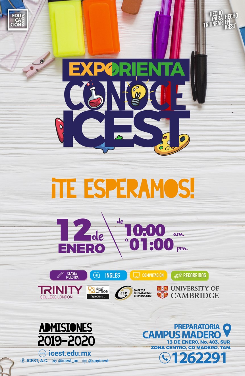 ICEST, A.C., te invita este 12 de Enero a la Expo Orienta, en la Preparatoria ICEST Campus Madero. Conoce nuestras instalaciones a partir de las 10:00 A.M. y resuelve todas tus dudas.