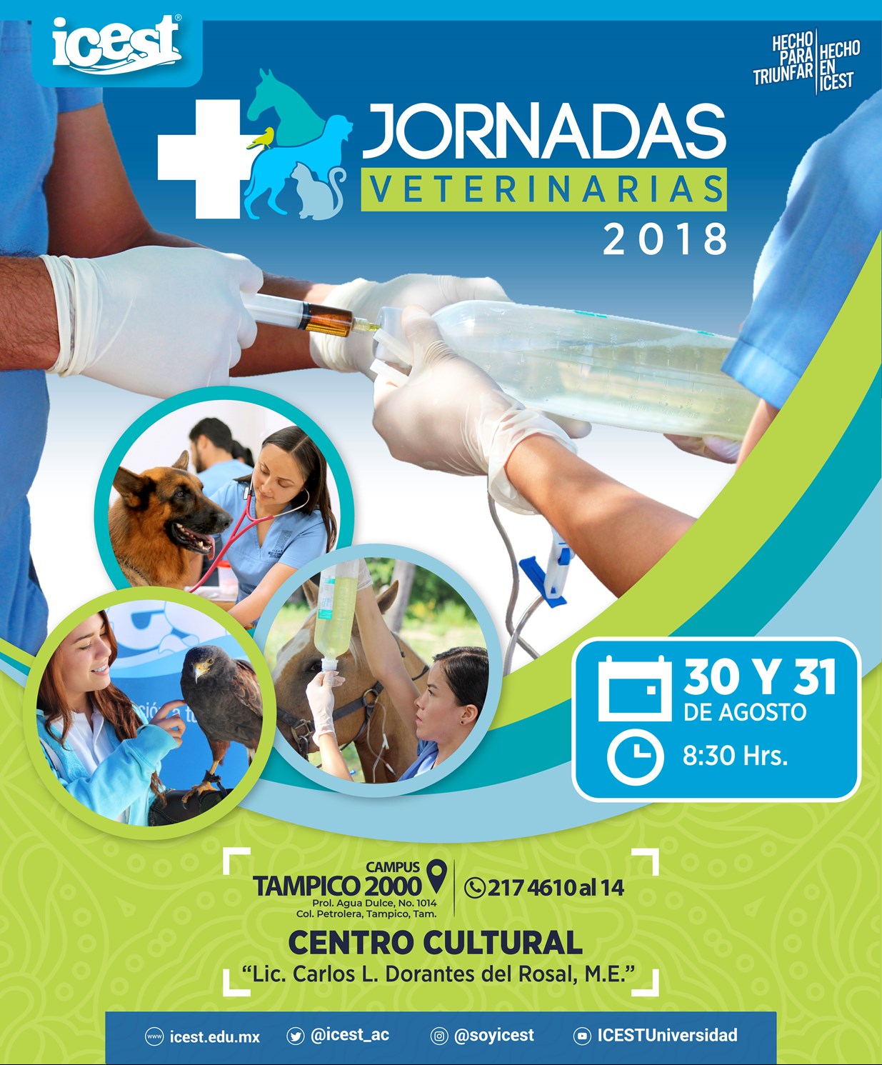 ICEST, A.C invita a todos los alumnos e interesados en estudiar la carrera de Médico Veterinario Zootecnista a las Jornadas Veterinarias 2018, este 30 y 31 de Agosto en punto de las 8:30 AM, en el Centro Cultural Carlos L. Dorantes del Rosal, M.E. en el Campus Tampico 2000.✔️Entrada Libre🏫Prolongación Agua Dulce No. 1014, Diagonal Norte-Sur Col. Petrolera, Tampico Tamaulipas.📞Tel. 217-4610 al 14