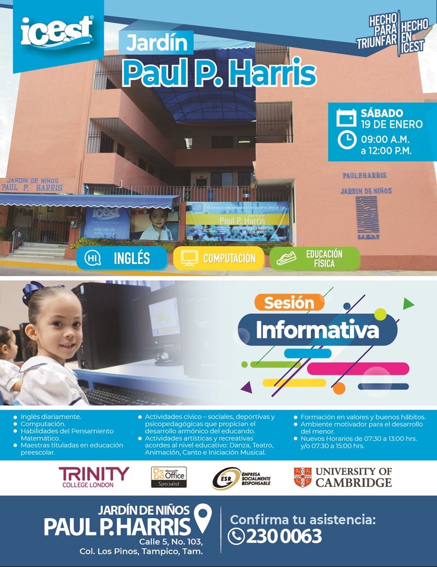 ICEST A.C., te invita este Sábado 19 de Enero a la Sesión Informativa del Jardín de Niños Paul P. Harris. Conoce nuestras instalaciones a partir de las 09:00 A.M. y resuelve todas tus dudas.