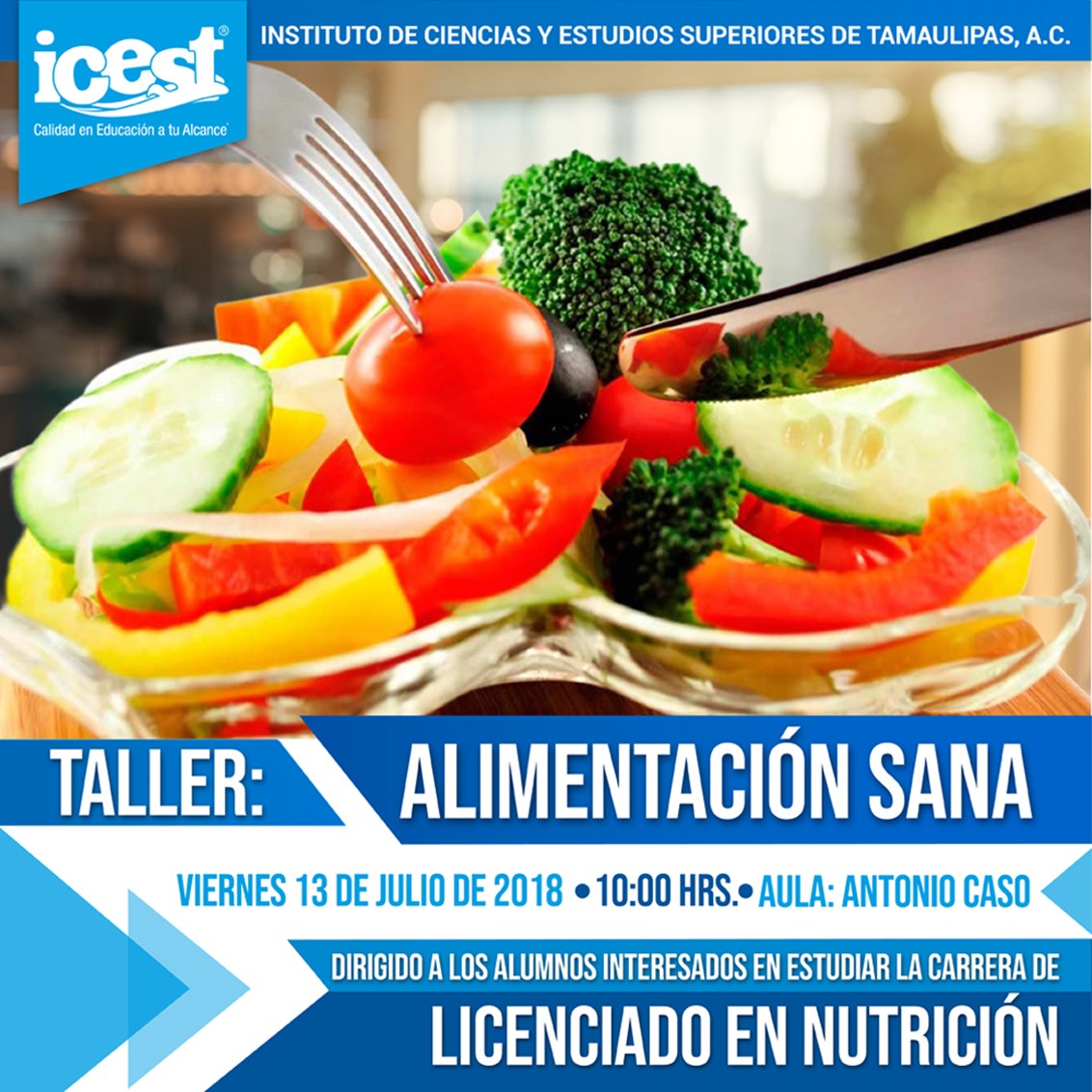 ICEST invita a todos los interesados en estudiar la Lic. en Nutrición al Taller "Alimentación Sana" este 13 de Julio 2018 en punto de las 10:00 am, en el Aula "Antonio Caso" de ICEST Campus Tampico 2000, visítanos en Prolongación Agua Dulce No. 1014, Diagonal Norte Sur, Col. Petrolera, Tampico Tamaulipas.Entrada Libre.