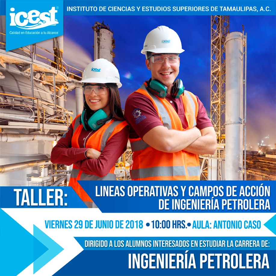 ICEST invita a todos los interesados en estudiar la carrera de Ing. Petrolera a que asistan al Taller Líneas Operativas y Campos de acción de Ingeniería Petrolera, este 29 de Junio en punto de las 10:00 am en el Aula Antonio Caso del Campus Tampico 2000.